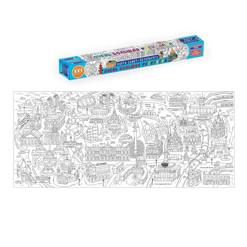 Эта раскраска-плакат станет отличным развлечением для всей семьи: её могут раскрашивать одновременно несколько человек! На ней изображена карта Санкт-Петербурга. Вы познакомитесь с главными достопримечательностями этого замечательного города, а также вас ждут интересные задания, развивающие внимательность и смекалку. Когда картинка будет полностью раскрашена, можно повесить её на стену и любоваться своим творением!