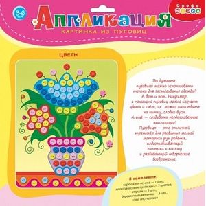 В наборе: цветная основа с рисунком и схемой размещения деталей, разноцветные пуговицы (5 цветов), декоративные элементы из дерева (цветочки), декоративные элементы на самоклеящейся основе (стразы), клей, цветная листовка-образец.