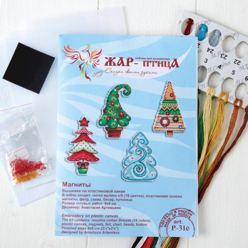 Состав: пластиковая канва, нитки мулине 16 цветов, магнитное полотно, фетр белого цвета, схема и руководство по вышиванию.